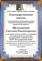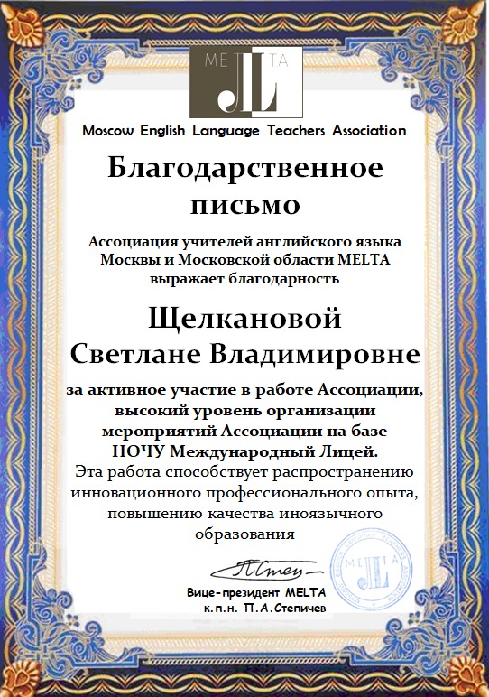 Ассоциация учителей английского языка Москвы и Московской области MELTA вручила Щелкановой С.В. Благодарственное письмо за активное участие в работе Ассоциации, распространение инновационного профессионального опыта, повышение качества иноязычного образования и высокий уровень организации мероприятий Ассоциации на базе НОЧУ "Международный лицей", проведенных в 2024-25 учебном году.
