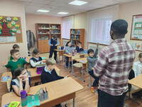 Kaela Mathews Mulenga провел деловую игру «Мастерская переговоров», в которой группы старшеклассников презентовали произведенные в России товары в качестве экспорта в страны Африки. В рамках игры Mathews представлял правительство Замбии, а ребята – компании из России. Живой интерес ученики проявили к заданию, где надо было угадать достоверность представленных утверждений о Замбии и о США. Удивление вызвали факты о том, что в Замбии люди обращаются друг к другу по фамилии, а в Чикаго существует единственная река в мире, течение которой обратили на прямо противоположное изначальному. Самое главное - это был живое общение на английском языке!